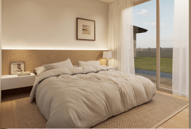 The bedroom render presents a calm and comfortable sleeping environment with large glazing, soft finishes and a bright interior mood suited to compact premium accommodation.