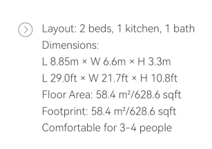 | Imperial dimensions (as shown in brochure) | L 29.04 ft × W 21.17 ft × H 10.8 ft |