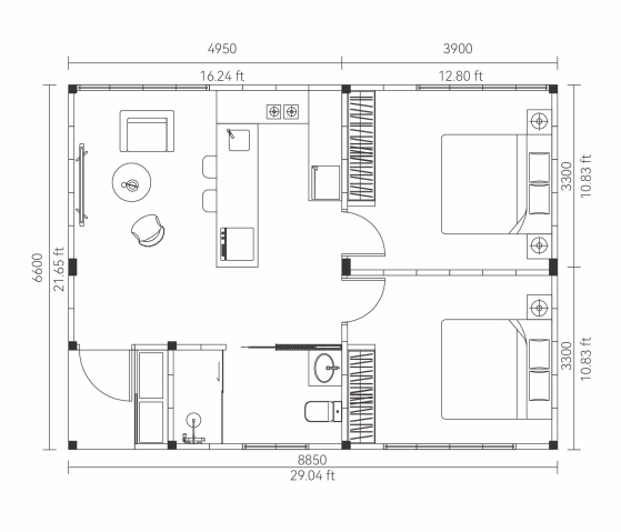 With a clean architectural form, two bedrooms, one kitchen and one bathroom, EcoHome K3 is suitable for 3–4 people and supports a wide range of residential and commercial applications including hotel, office, coffee shop, tea room, vacation home, vacation rentals, guesthouse, bed and breakfast, lounge and hotel housing.