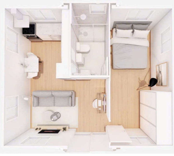 | Configuration | 1 or 2 bedrooms · 1 toilet · kitchen · dining · living |