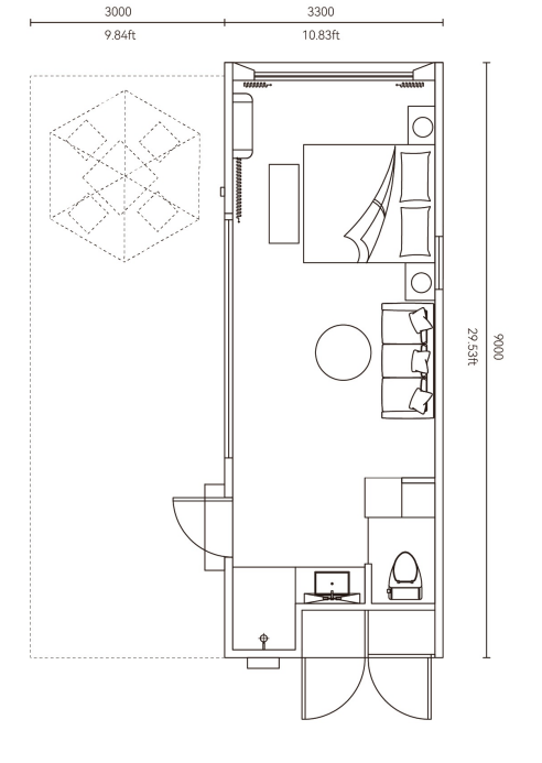 Studio + 1 bath layout with a generous open interior, suitable for 2–3 people.